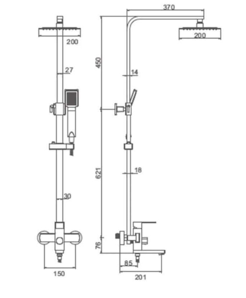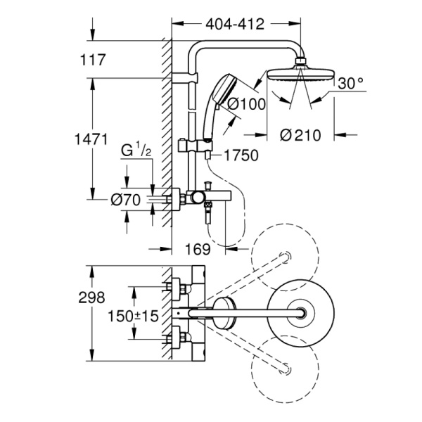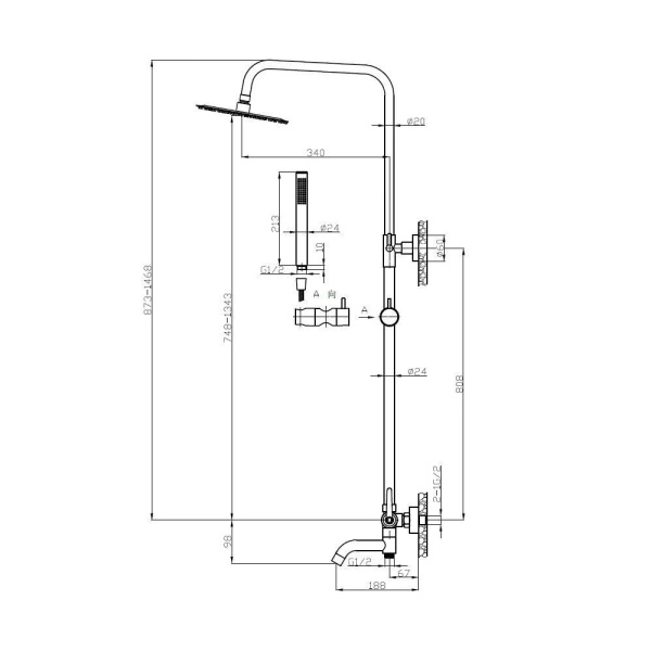 3. Штанга. Опора, фиксирующаяся на стене, внутри которой чаще всего проходит гибкий шланг. В верхней ее точке находится верхний душ, подающий воду вертикально. Его положение не меняется практически ни в одной из моделей. Здесь же размещен кронштейн для лейки.