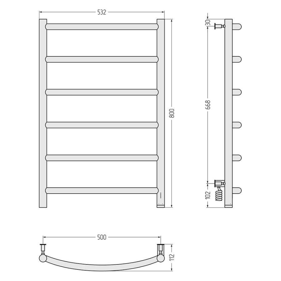 Полотенцесушитель, блок управления с кабелем, интегрированное в корпус скрытое подключение, телескопические кронштейны, шестигранный ключ, дюбели и саморезы