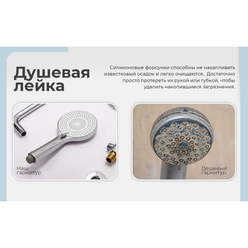 смеситель; монтажный блок; верхний душ; кронштейн верхнего душа; ручной душ; душевой шланг; настенный держатель; инструкция.