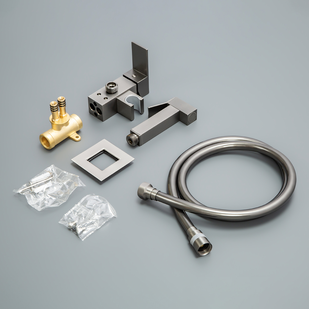 смеситель; монтажный блок; гигиенический душ; душевой шланг; инструкция.