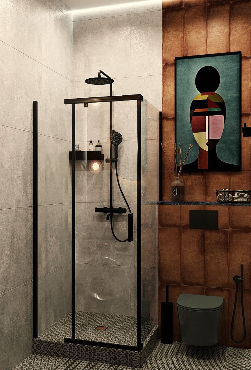 Этот проект, сан узла – для тех, кто готов к смелым экспериментам. Насыщенный терракотовый оттенок, необычное зеркало, строгие черные детали - здесь нет ничего случайного. Это пространство, которое отражает индивидуальность и не боится популяризироваться.