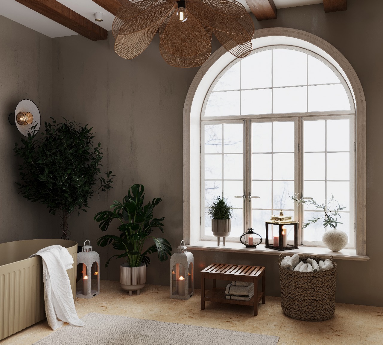 Завершает образ окно в виде арки, пропускающее мягкий дневной свет, и деревянные балки на потолке, добавляющие пространству шарма и ощущение основательности.