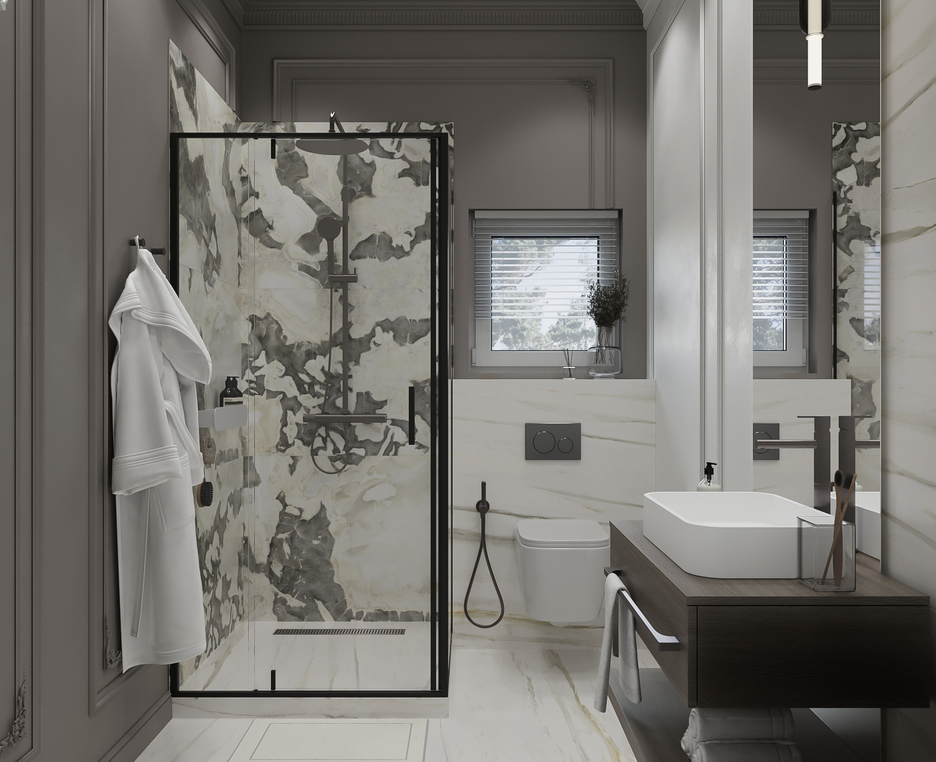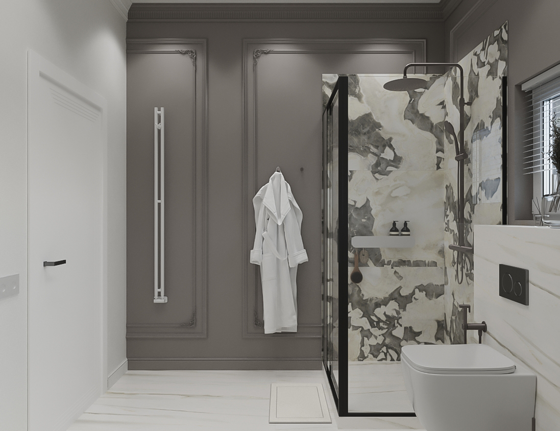Санузел «Молочный шепот» - это воплощение спокойствия и изысканности. Мягкие молочные тона плитки, натуральный мрамор с тонкими прожилками и молдинги на стенах создают утончённую гармонию. Каждая деталь, от освещения до фурнитуры, подчеркивает минимализм и элегантность. Проект доказывает, что гармония в деталях рождает умиротворение.