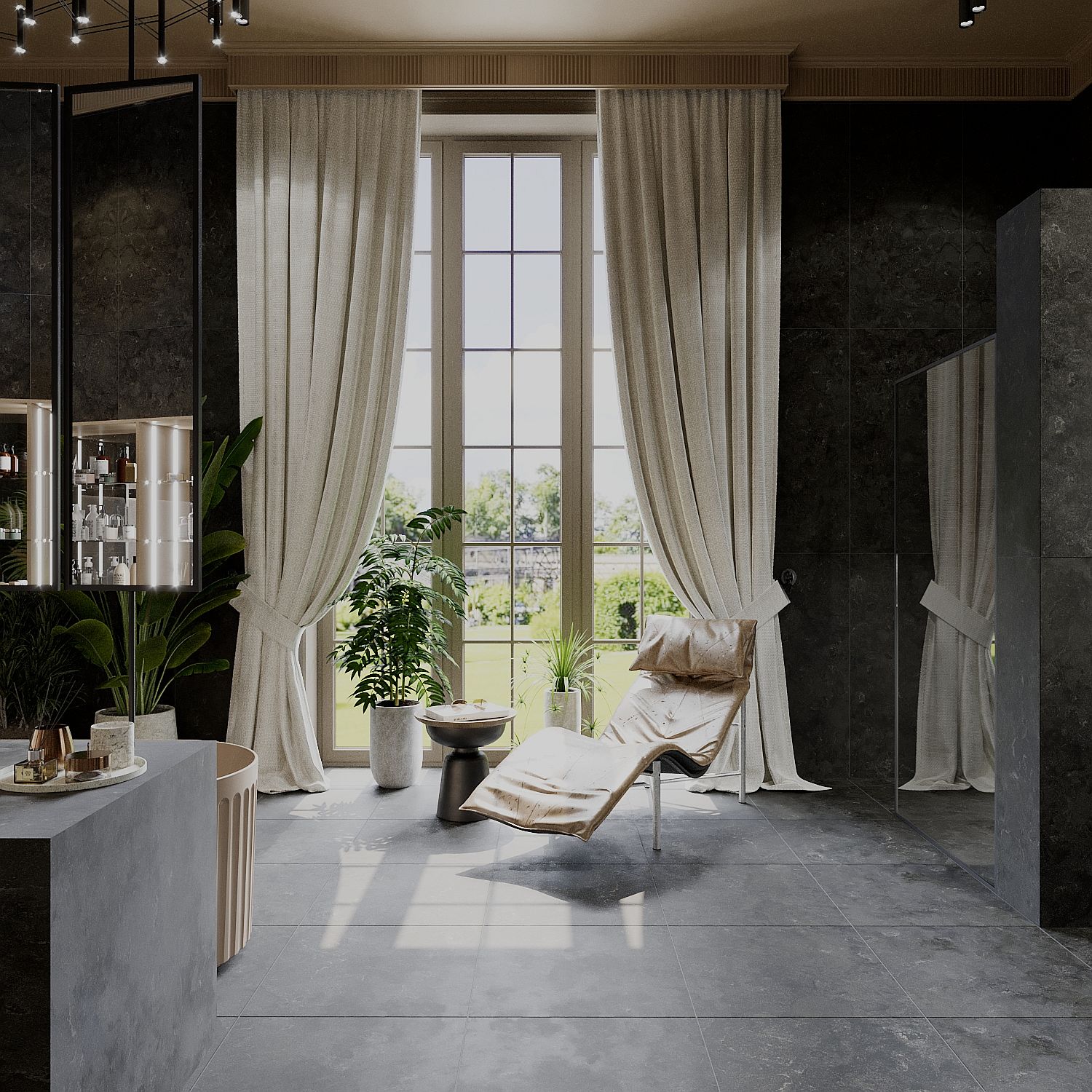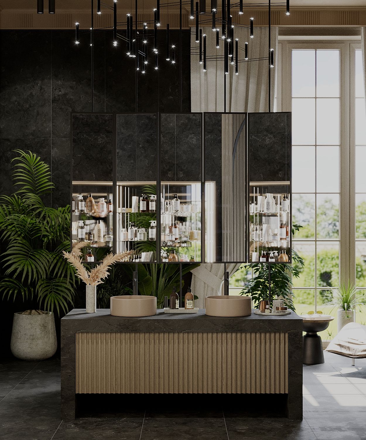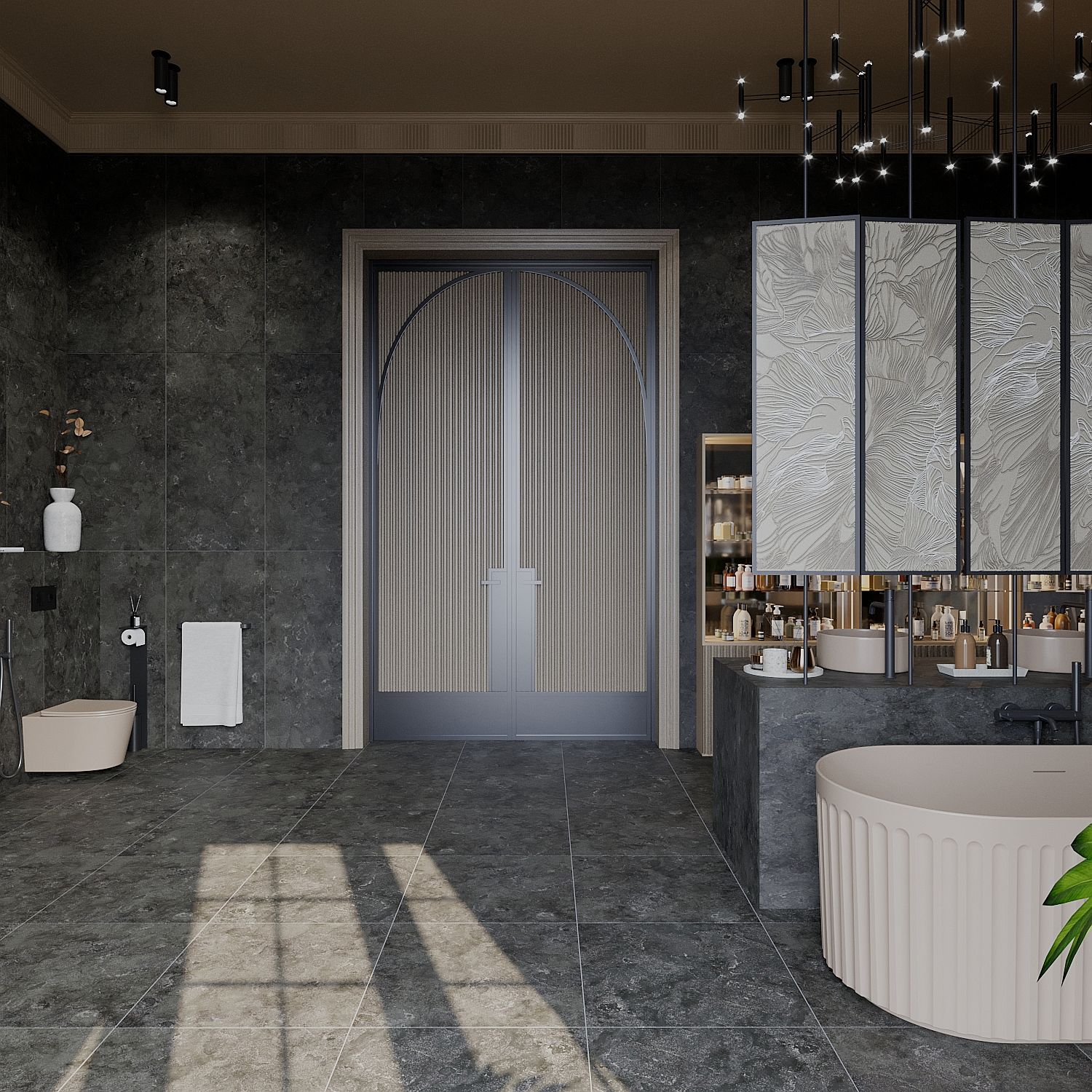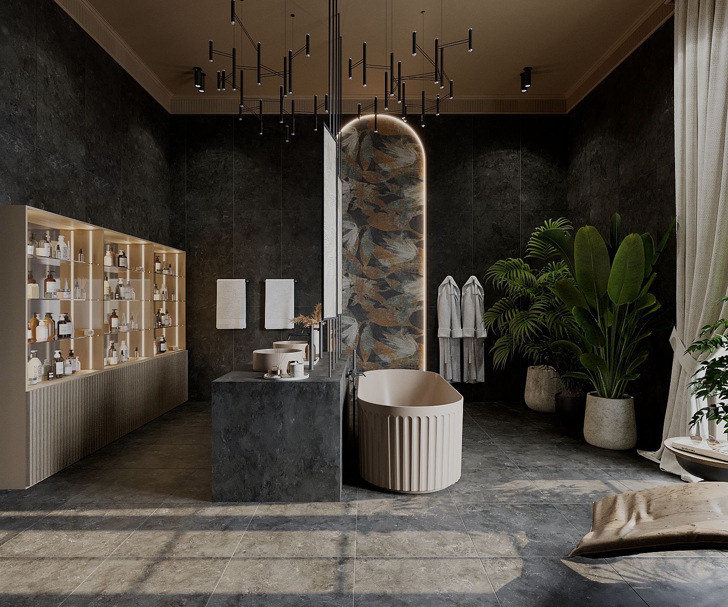 Перед Вами мастер-ванная комната при главной спальне в частном доме в городе Сочи . В своём проекте я хотел подчеркнуть масштабы помещения, выделить окно, так как окна всегда украшение любого помещения, не говоря о ванных комнатах. Сохранить простор, при этом разместить всё необходимое для своих Главных Героев. В этом как я считаю способствует уникальная не стандартная планировка.