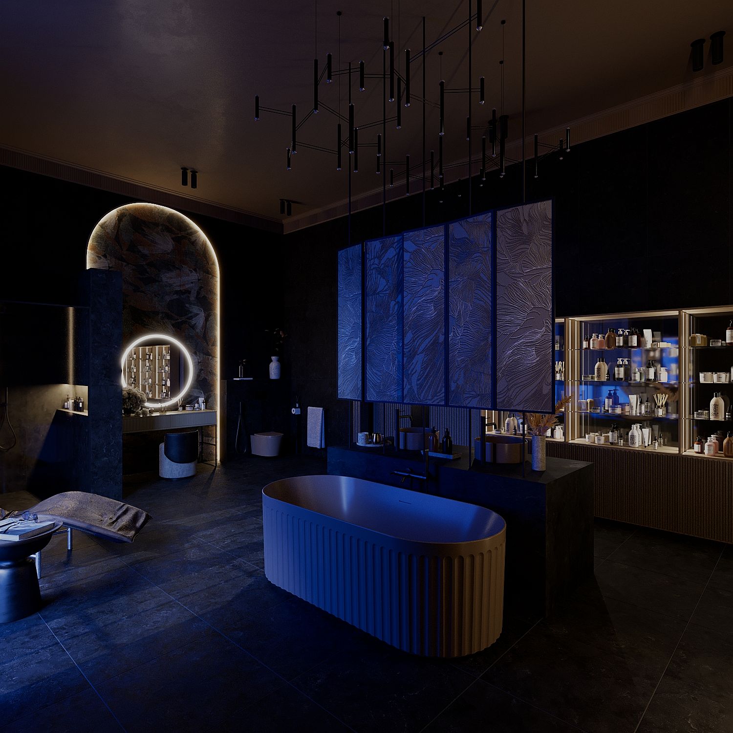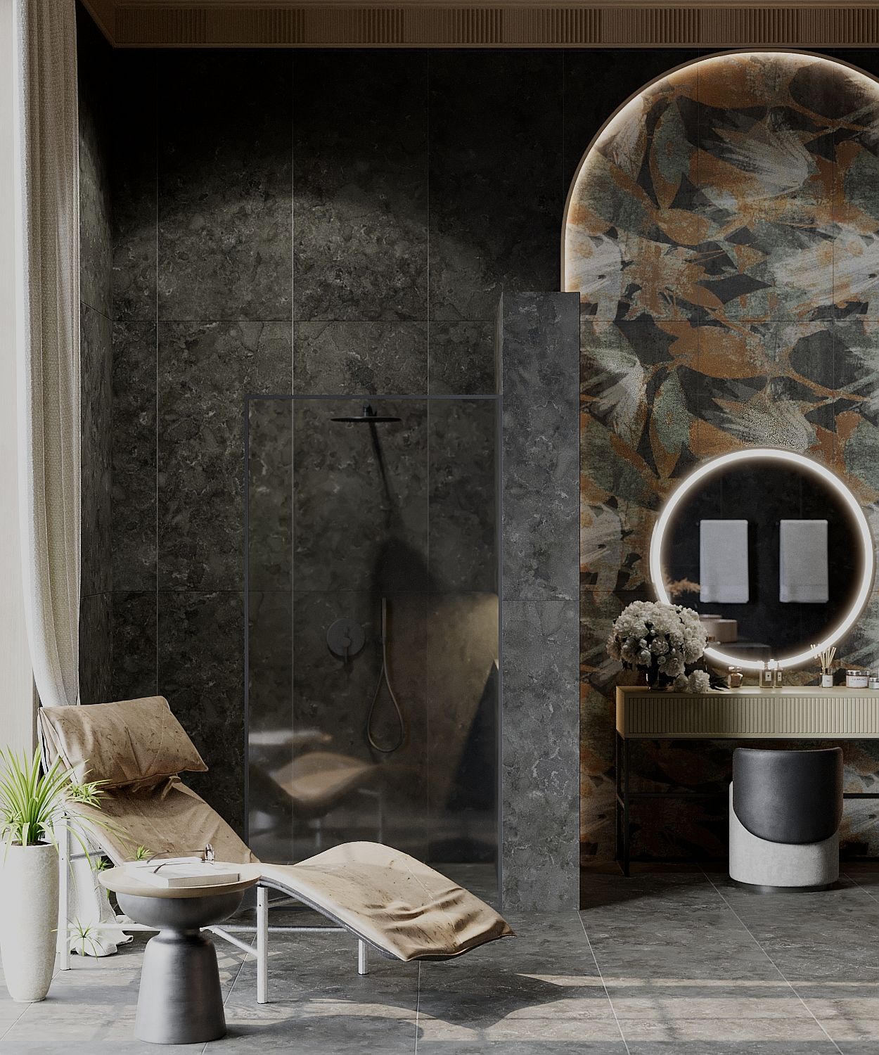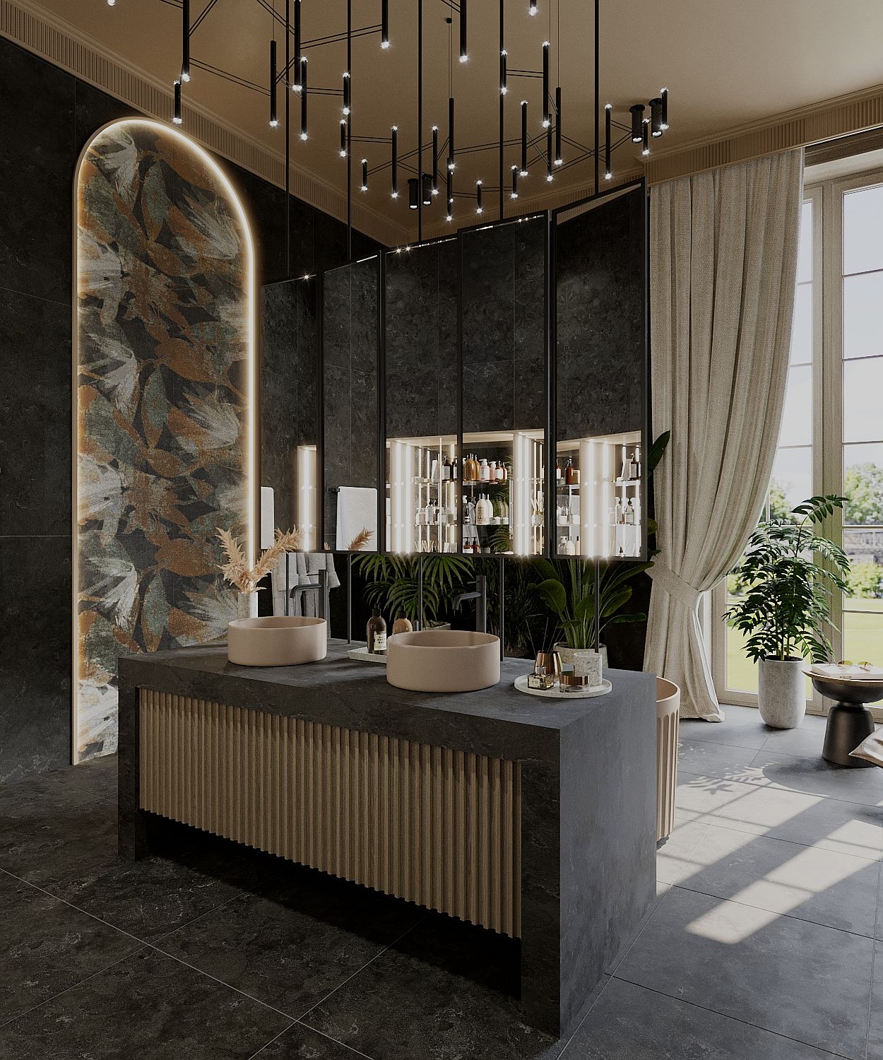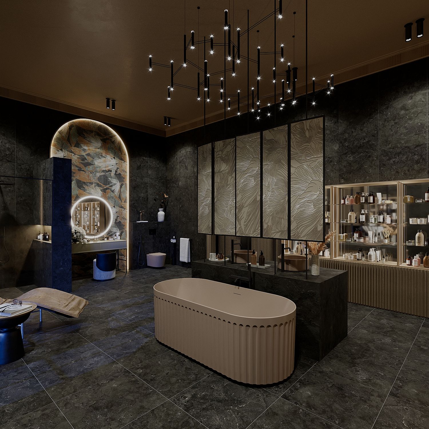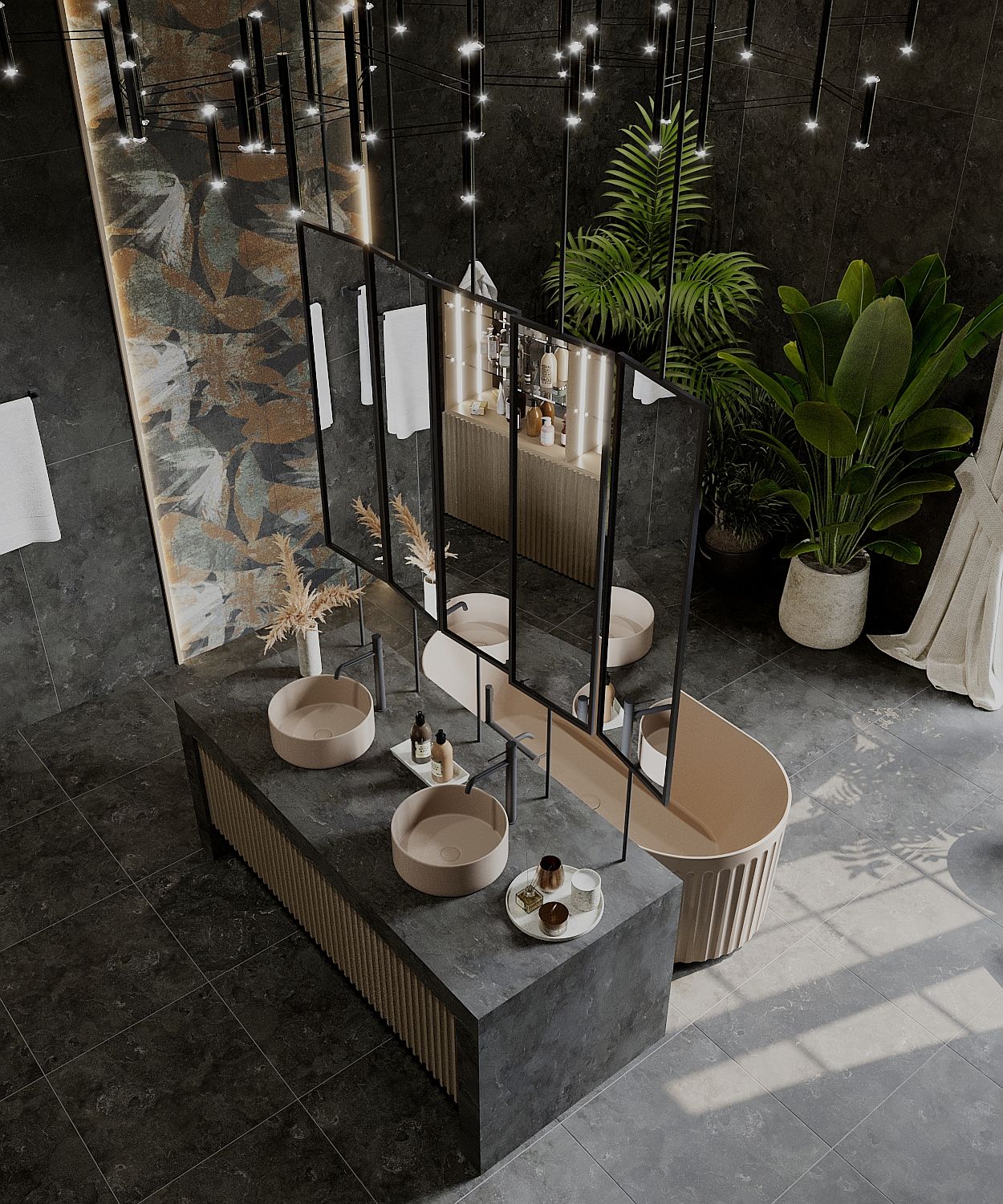 В плане оформления мною был выбран театральный почти чёрный керамогранит, где я разбавляю его яркими вставками, а также вношу дополнительные цвета, которые можно сказать и делают эту комнату тёплой, уникальной и на мой взгляд сохраняя её сдержанной, что немаловажно. Конечно это было бы не возможно без уникальных цветных предметов сантехники