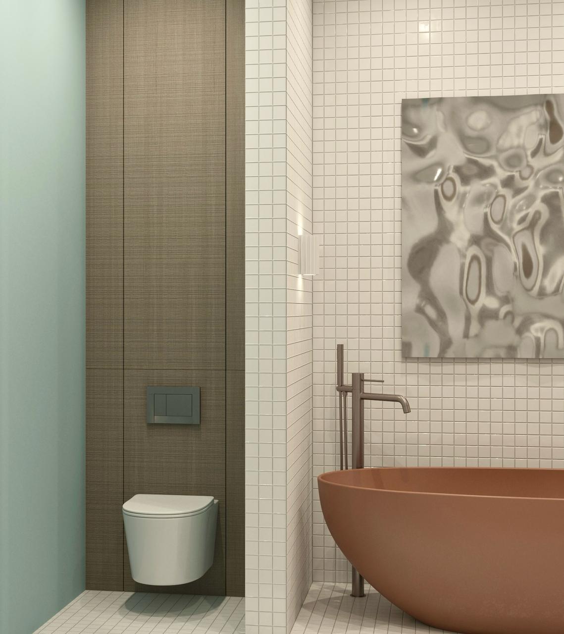 Проект "Цвет в деталях" представляет собой сочетание минимализма и ярких акцентов, создавая уникальное пространство, которое привлекает внимание и вдохновляет. Основой дизайна служит белая мелкая плитка, которая создает чистый и свежий фон, позволяя цветной сантехнике стать главным героем интерьера.
