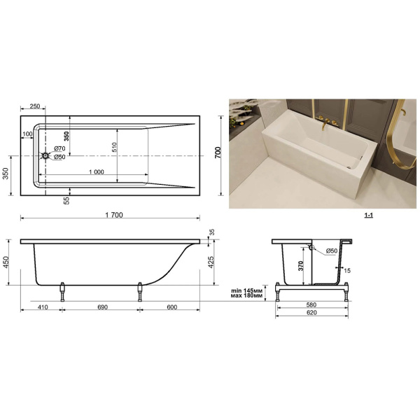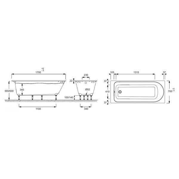 Ванна из искусственного камня Kupala Lono 170x70 белая матовая, с ножками и донным клапаном